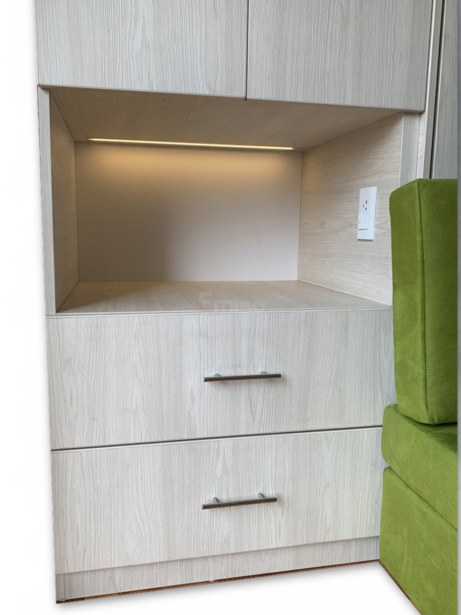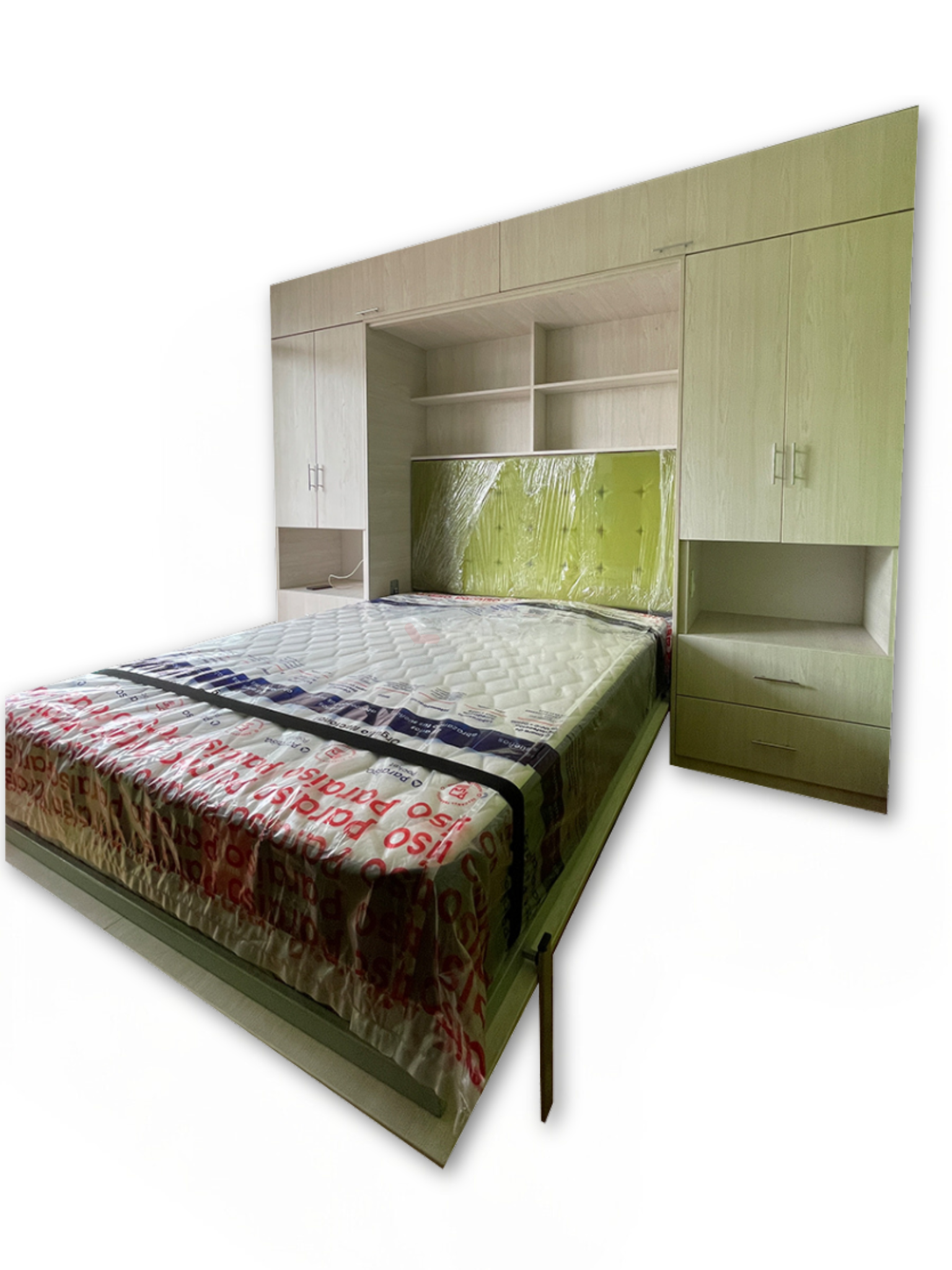 Utilizamos Melamine pelicano de 25 milímetros y 18 milímetros para garantizar la resistencia y durabilidad de nuestras camas. Los amortiguadores a gas facilitan el subir y bajar de la cama, brindando practicidad y comodidad. Al igual que con nuestros sofás camas, nuestras camas abatibles queen size pueden ser personalizadas según tus gustos y necesidades.